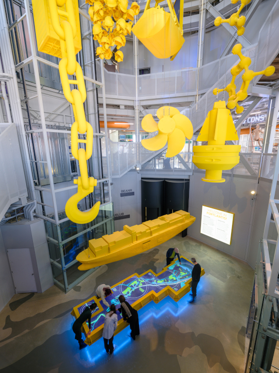 ‘Portlantis is een echte blikvanger, maar ook een soort uitkijktoren,’ vertelt Winy Maas, medeoprichter van MVRDV. ‘Voor veel Rotterdammers is de haven iets op de horizon, daar in deverte, zonder dat zij echt weten wat er gebeurt. Portlantis biedt mensen de kans om dat te ontdekken. Bezoekers kunnen zien hoe de haven verandert, wat dat betekent voor de stad en hoe het hun dagelijks leven beïnvloedt. En dat doet het gebouw op een hele efficiënte manier, als een machine die verhalen vertelt.’