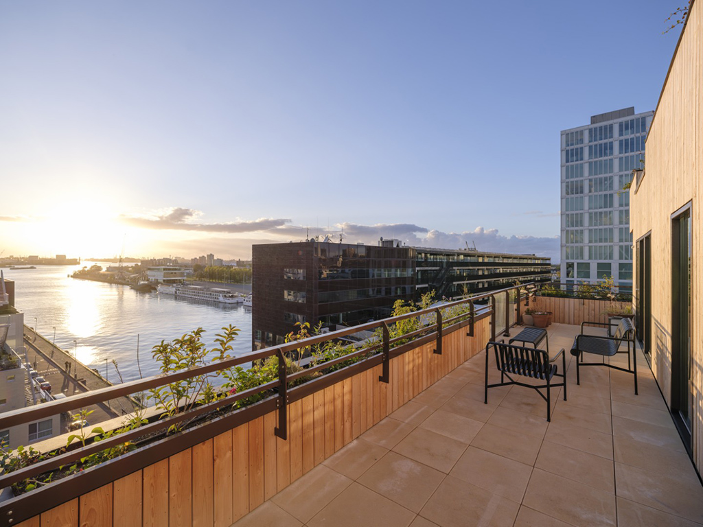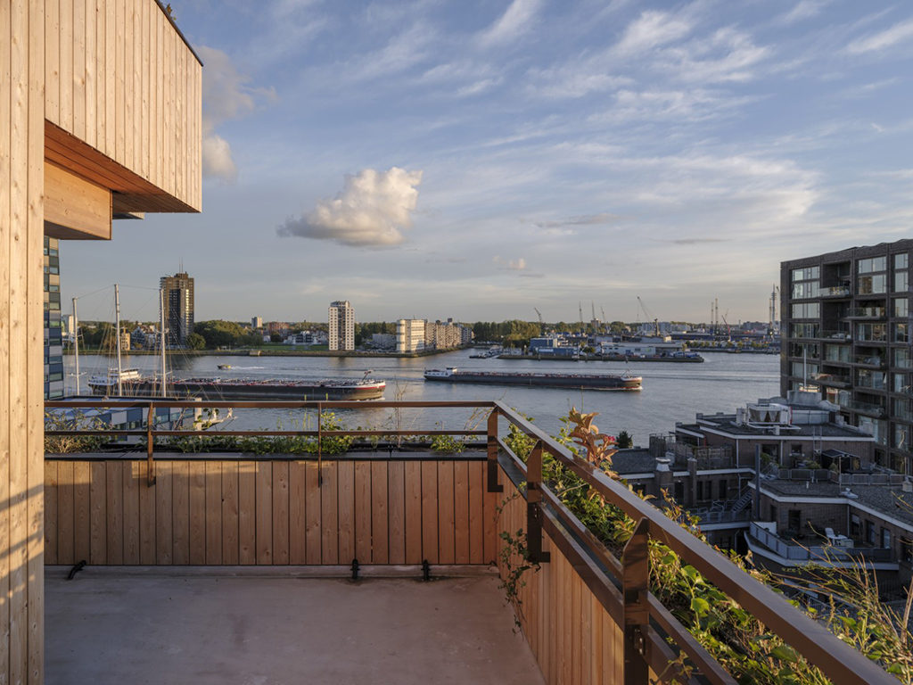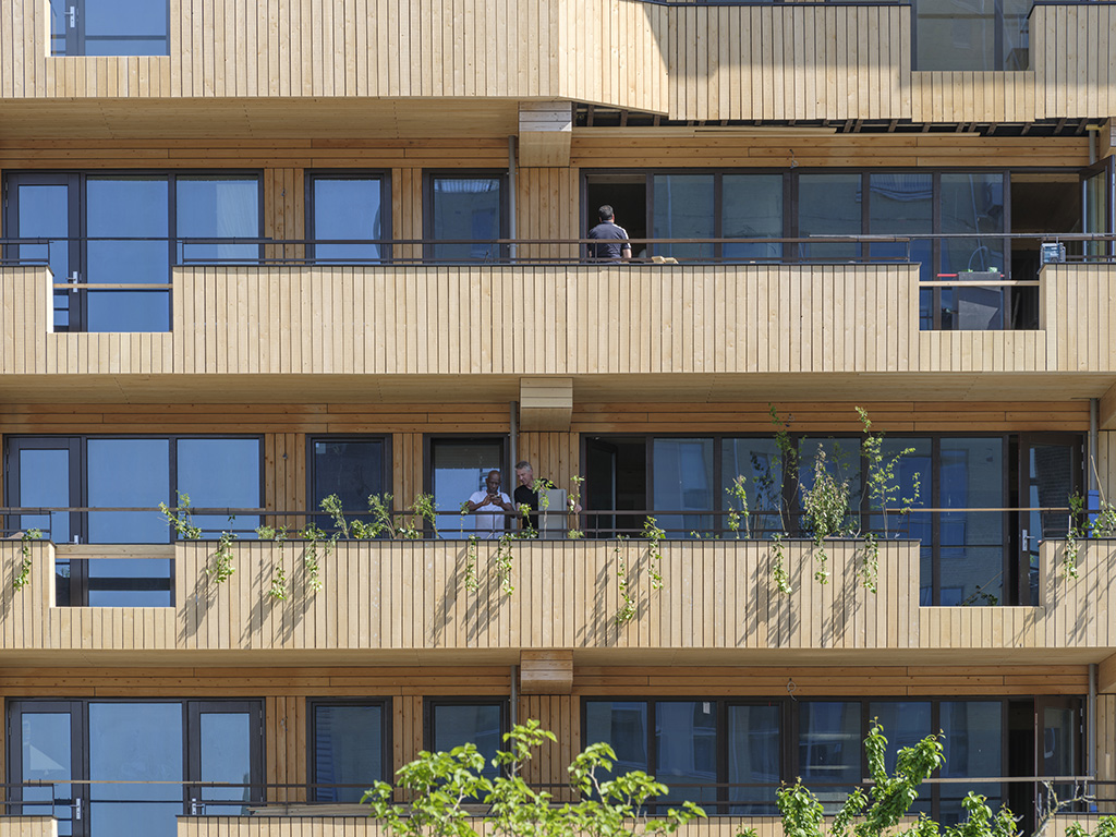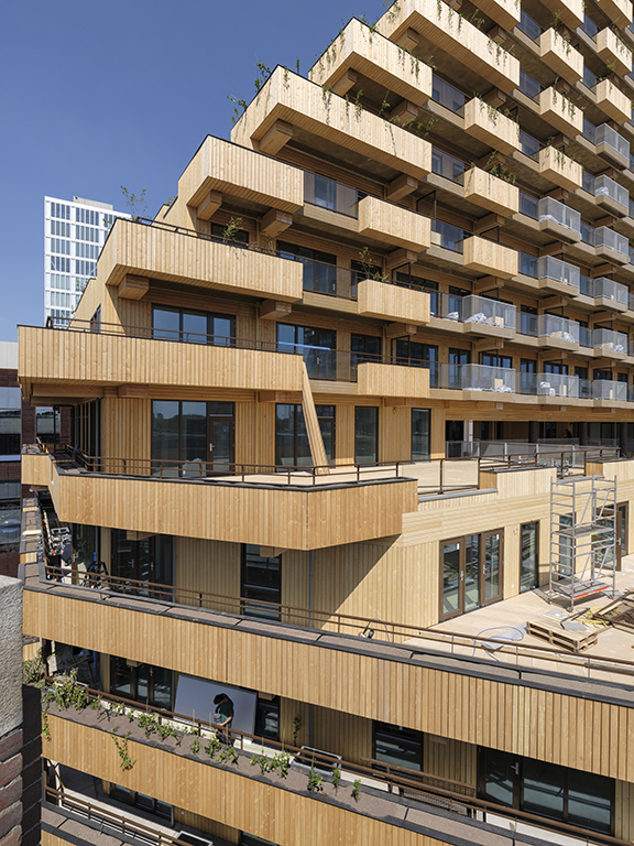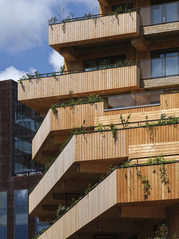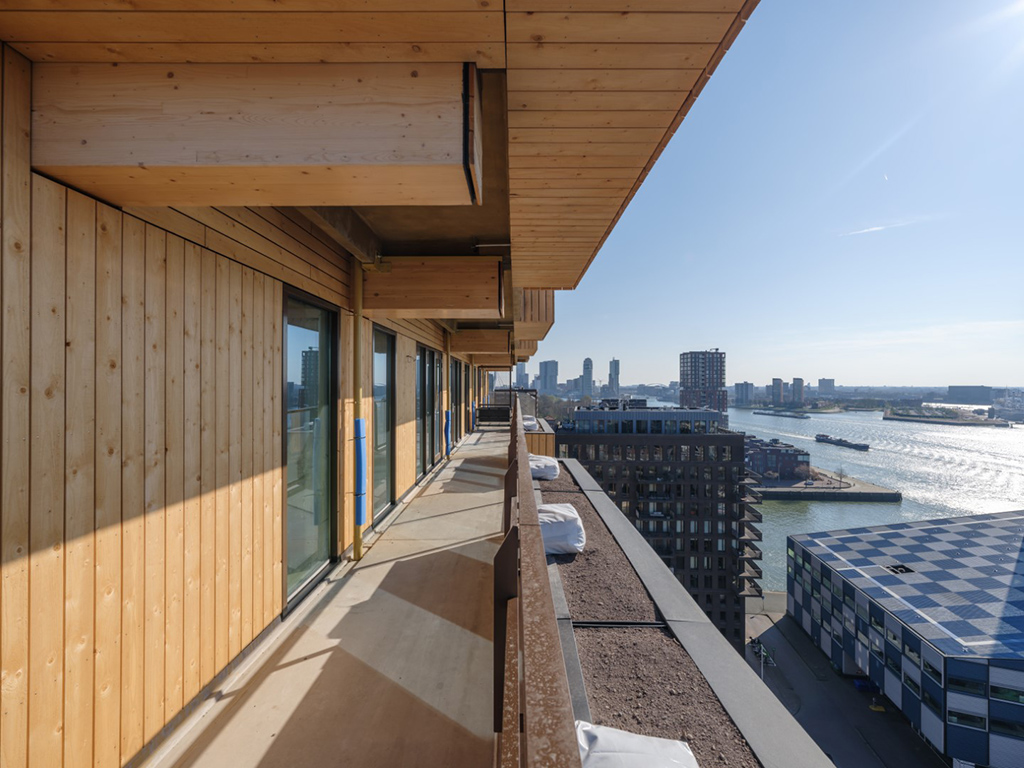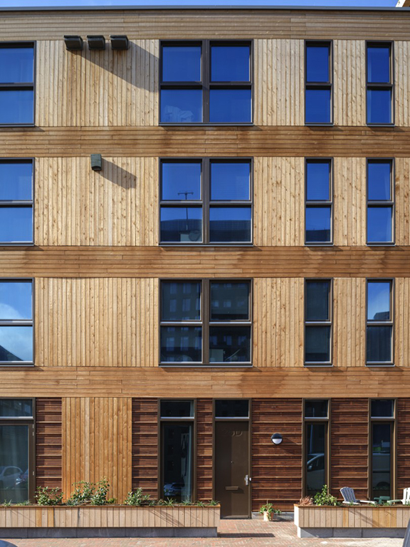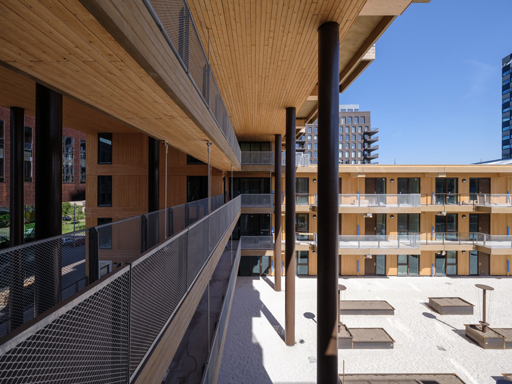 Het hout is in de woningen, op galerijen en balkons zoveel mogelijk in het zicht gelaten. Alleen in functionele ruimtes zoals berging, toilet en badkamer is het afgewerkt met gips.