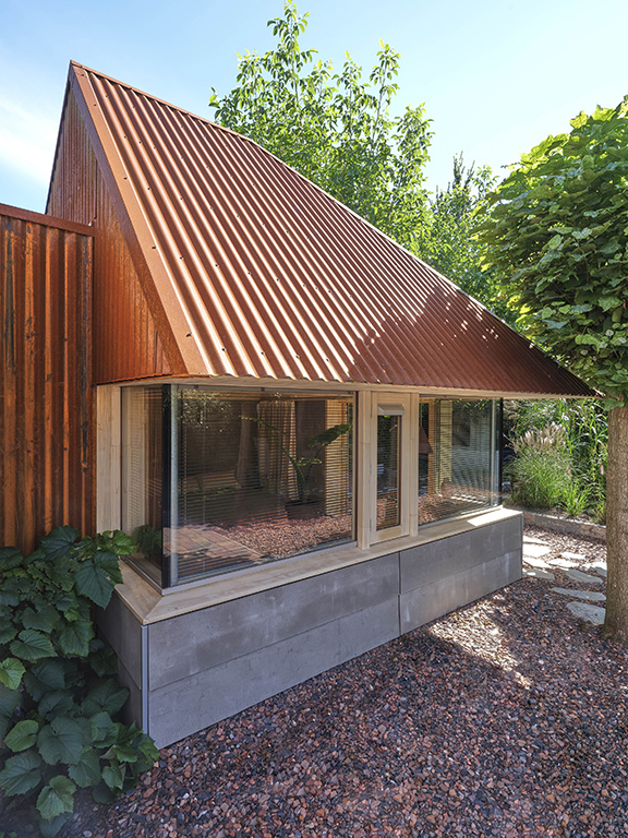 De aanbouw is precies op maat gemaakt en gesitueerd tussen de bestaande bomen in de tuin. Een grote Accoya houten schuifpui die buitenlangs de gevel schuift, versterkt het gevoel van in de natuur verblijven en slapen. Het regenwater dat op het corten stalen dak valt, wordt door het dak overstek voorbij de ramen begeleidt en valt daar in het rode mijnsplit. De gevel is van binnen en buiten opgetrokken uit Viroc panelen. Dat zijn vezelcementplaten die het rauwe karakter van beton hebben, maar die beter zijn te hanteren en te betalen. Boven de lage kasten loopt de glazen wand. Het glas loopt beide hoeken om, waardoor het grote dak hier lijkt te zweven en de ruimte optisch doorloopt. De glazen hoeken zonder Accoya houten kozijnen versterken dit. Doordat het glas op bedhoogte begint, kun je goed vanuit je bed de tuin inkijken. In principe is de raambekleding vanuit privacy oogpunt niet nodig, omdat de buren hier niet naar binnen kunnen kijken.